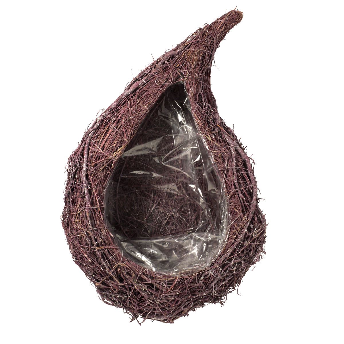 Pflanzgefäß in Tränenform aus Mühlenbeckia und Twiggy-Zweigen mit natürlicher Flechtstruktur. Geeignet für bepflanzte Arrangements oder dekorative Präsentationen. Mit integriertem Folienschutz.
